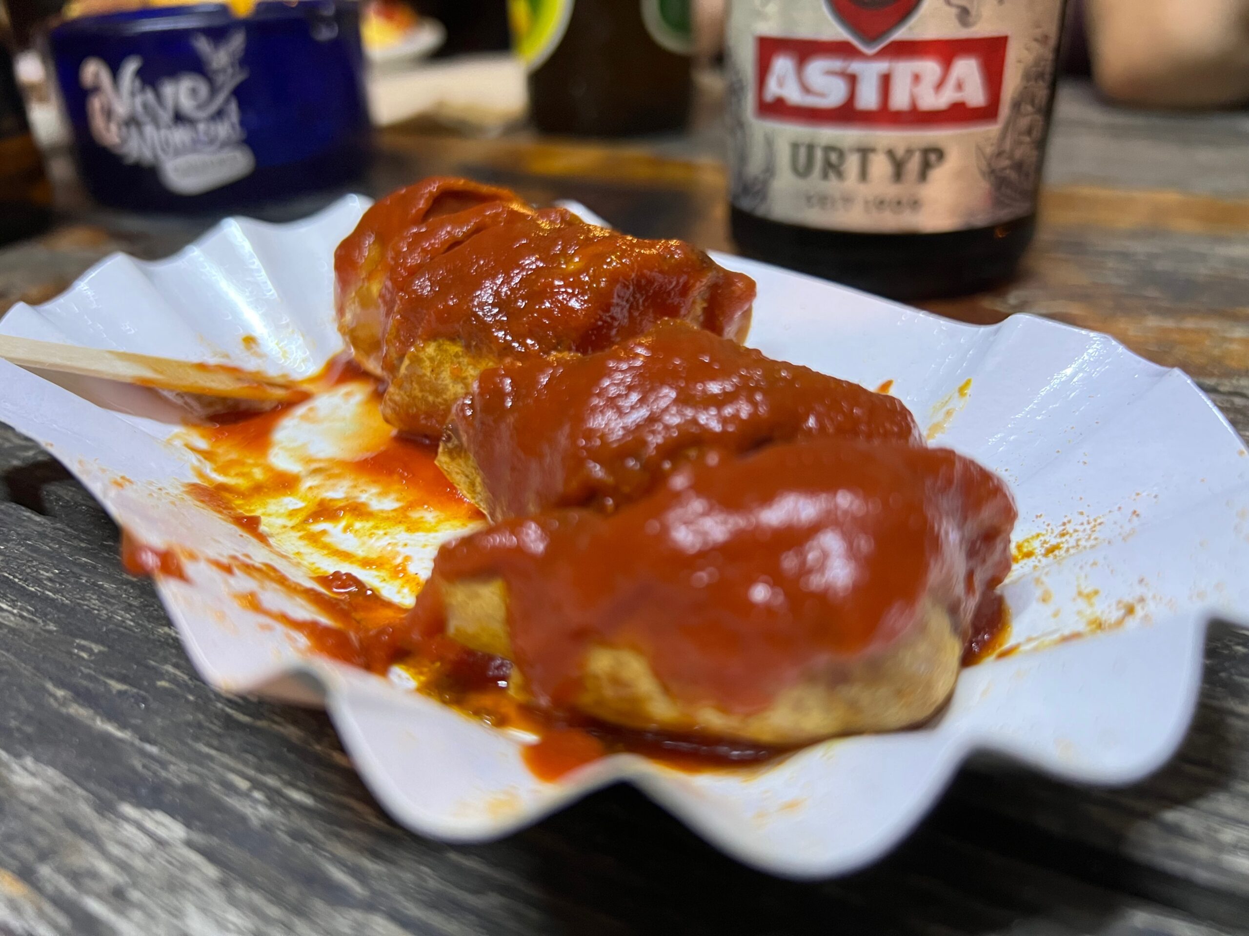 - Currywurst: Deep fried German Sausage with curry ketchup on top. They slice it open multiple times hamburger style