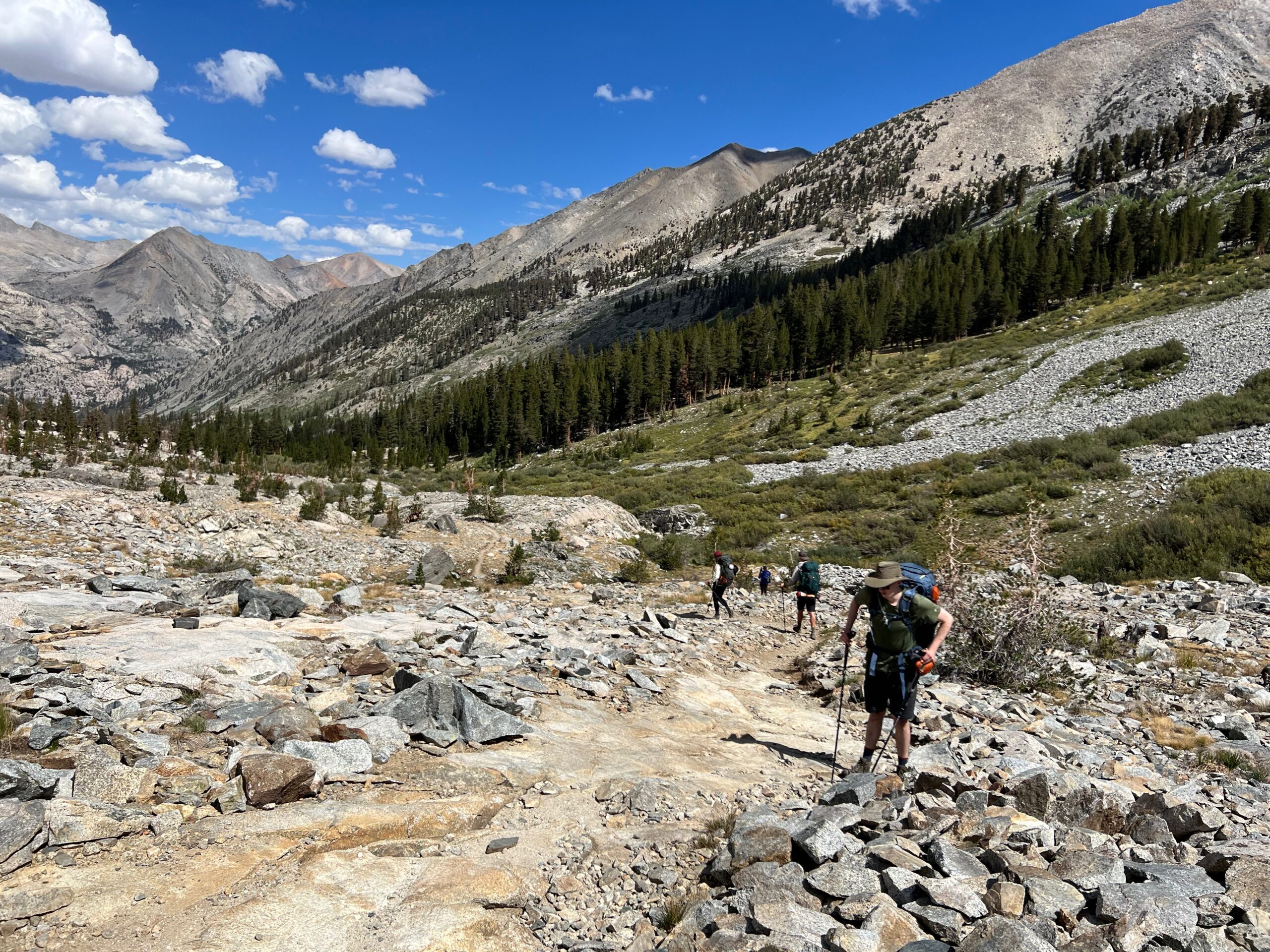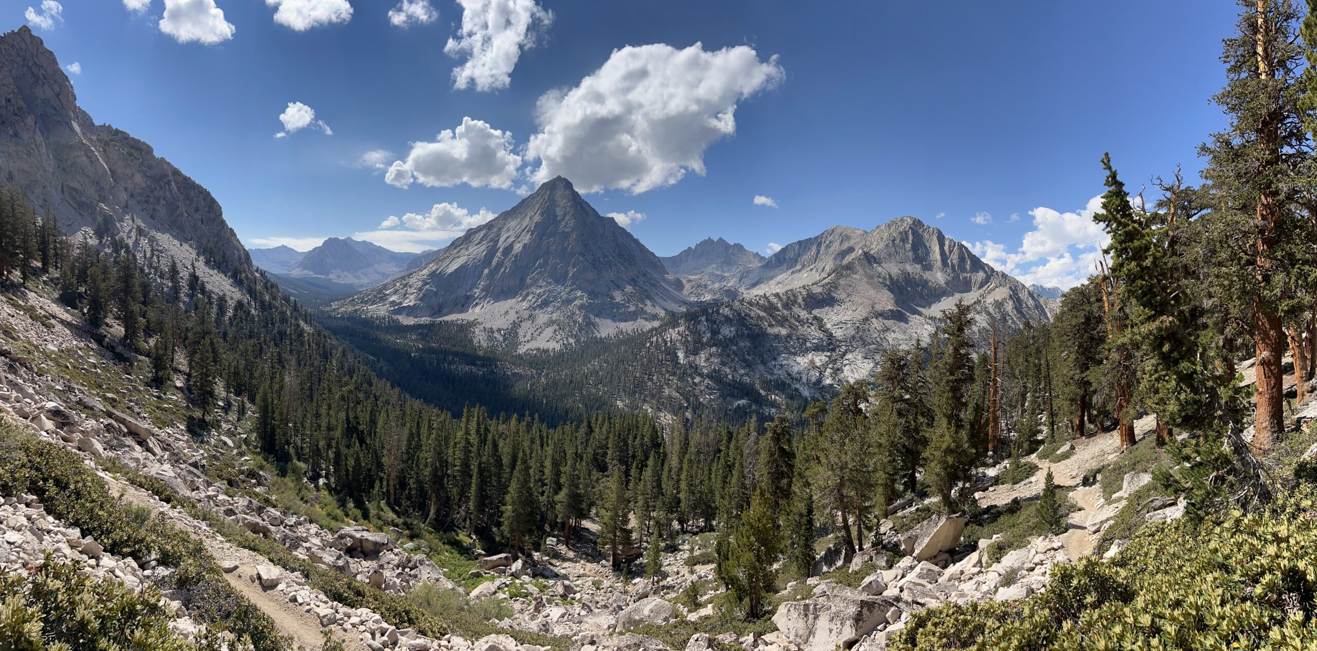 Started at 9:15 AM. Still an uphill climb of at least 2600 feet but because we started earlier the sun was much more manageable. We took a lunch break at Dollar Lake which is the first lake we saw after a rocky uphill climb through the valley. The views in the valley were incredible and I wish we camped here one night but we were all determined to get to Rae Lakes.